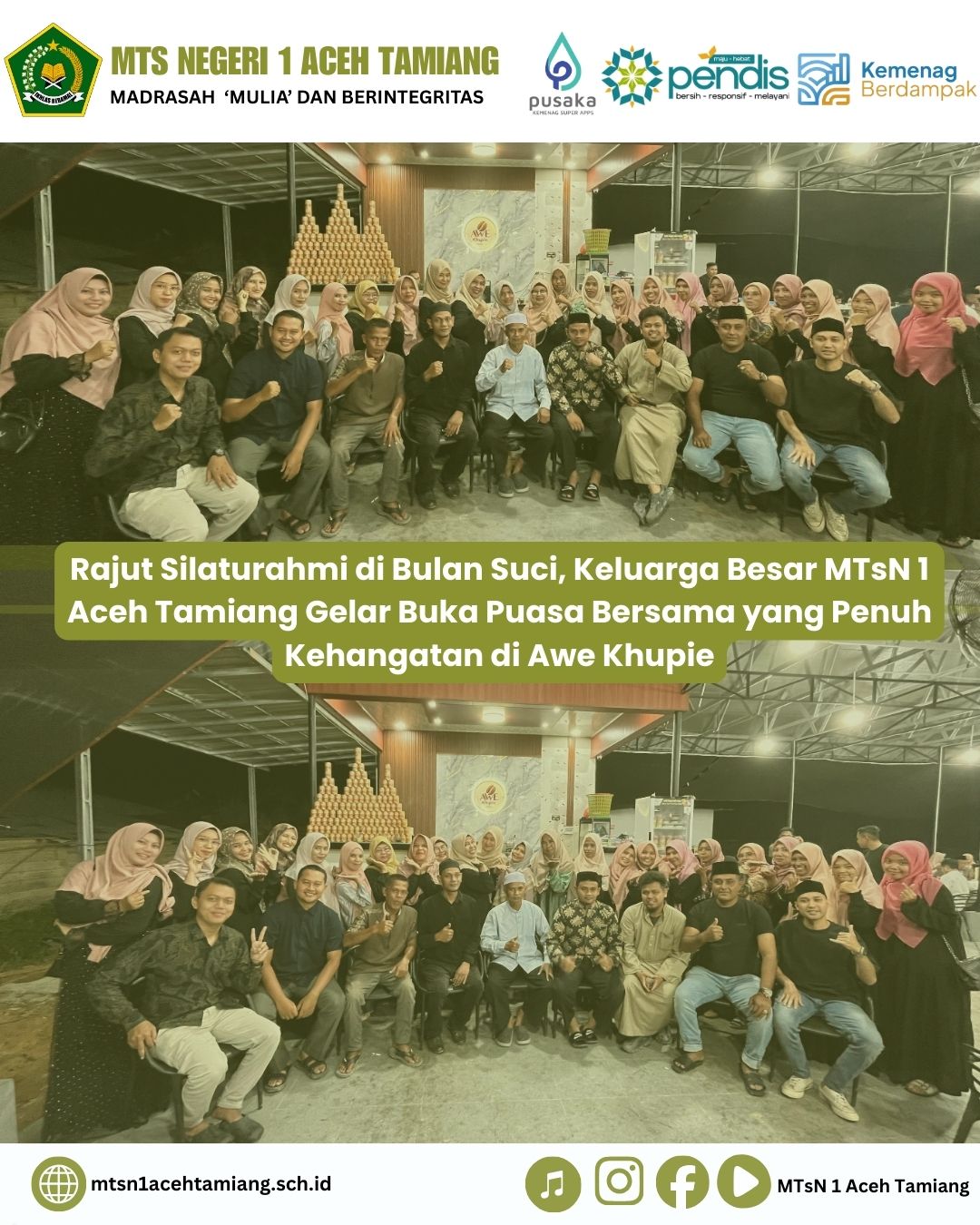 Tualang Cut, 14/03/26— Bulan suci Ramadan senantiasa menjadi momen yang tepat untuk mempererat tali persaudaraan. Mengambil berkah bulan penuh ampunan ini, Keluarga Besar Madrasah Tsanawiyah Negeri (MTsN) 1 Aceh Tamiang menggelar acara Buka Puasa Bersama yang diliputi suasana kekeluargaan dan kehangatan di Awe Khupie, pada [Sabtu, 14 Maret 2026].